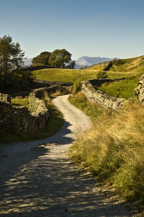 Great picture with the impressive s-shaped lead-in lines provided by the lane and walls, not to mention the foreground shadows, and the fell acting as focal point