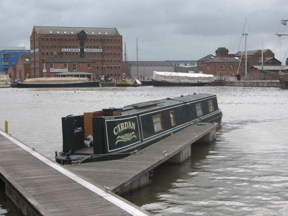 Narrowboat 'Cirdan', named after the shipwright in The Lord of the Rings, with the National Waterways Museum in a warehouse across the water.