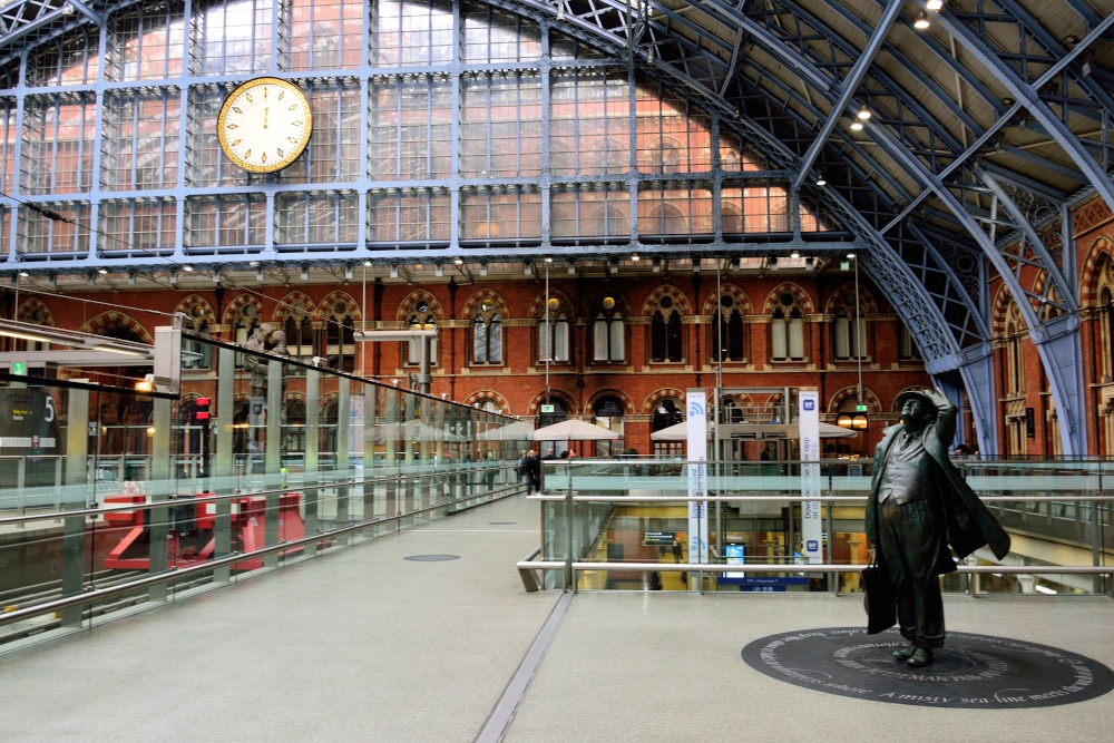 The bronze statue of Poet Sir John Betjeman was created and erected on the upper concourse of St Pancras station to celebrate his saving of the station from demolition in the 1960s.