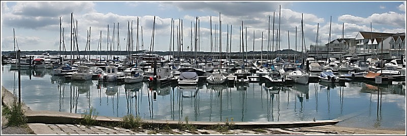 A Panoramic view of boats, masts and their reflections in a marina