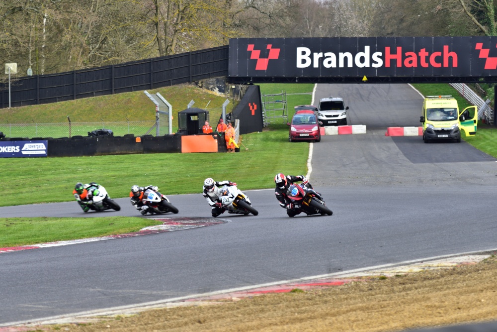Close racing in the Supersports class, as the pack enter Clearways at Brands Hatch.