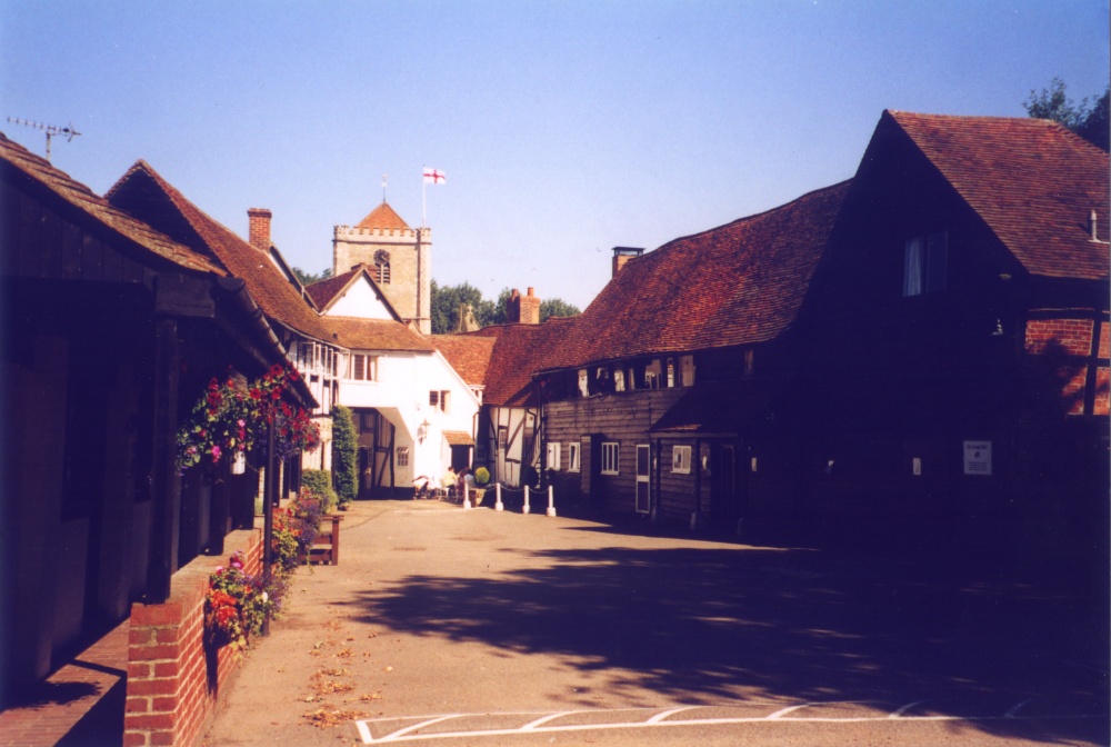 Dorchester on Thames, Oxfordshire. The Abbey Church of St Peter and St Paul, aka Dorchester Abbey, viewed from the coachyard of the George Hotel on the High Street. c. 2002.
