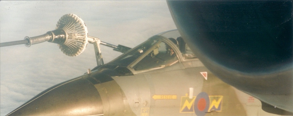 A RAF jet is refuelled by a VC-10 over the North Sea in 1998. We had flown out from RAF Lyneham and I took over 40 shots of various RAF fighter jets coming in to be refuelled. Amazing, slightly unreal views in a once-in-a-lifetime chance to witness these incredible encounters.