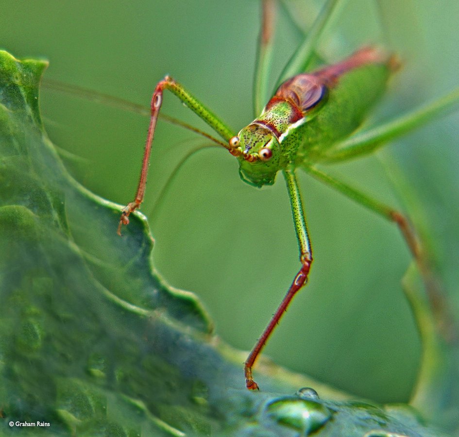 This Speckled Bush Cricket kept a close eye on me while I photographed it. It's one of many species of crickets and Grasshoppers to be found on the vegetation, along the banks of Cookwell Brook and the River Stour. - Graham Rains (photographer)