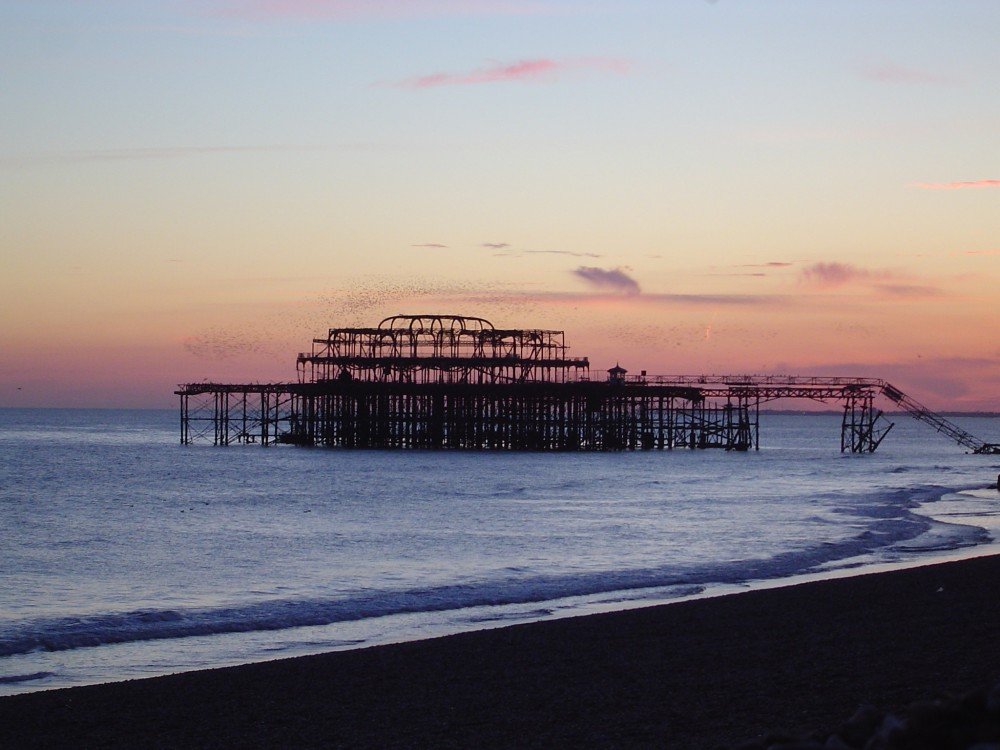 A lovely and haunting picture of the old destroyed Brighton pier at sunset. Look closely for a silhouetted flock of birds.