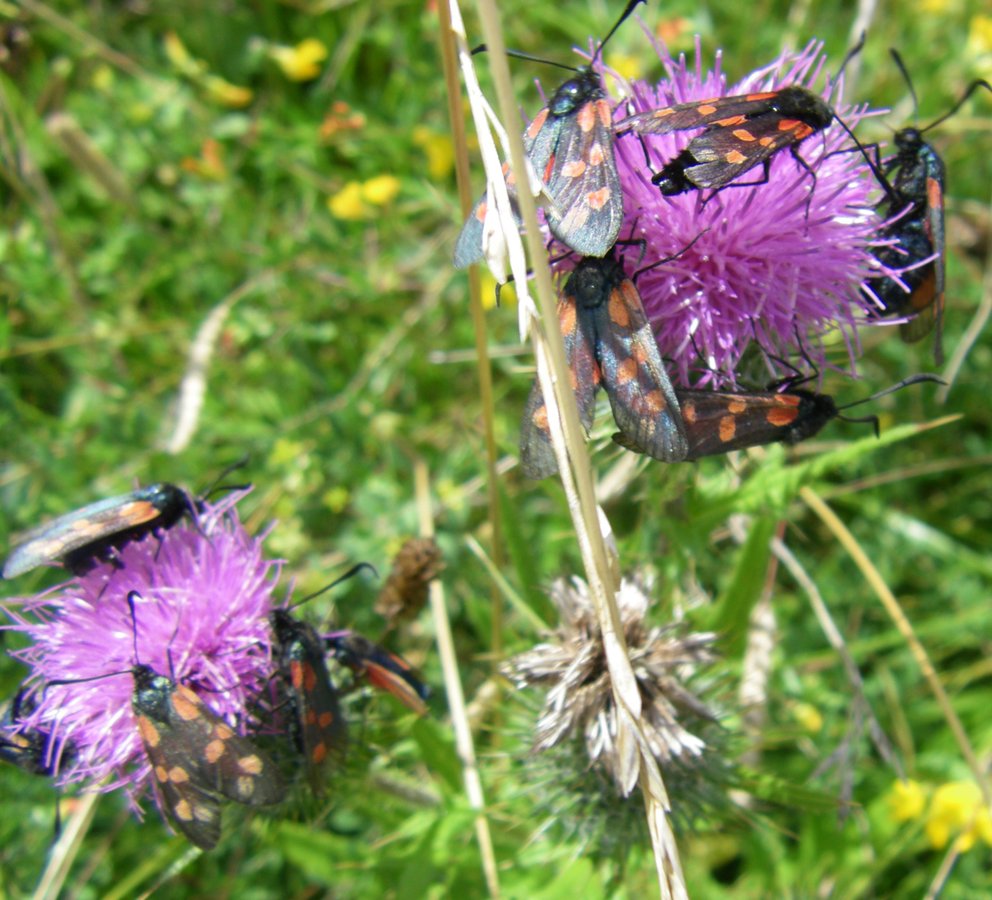 An amazing amount of Six-spot Burnet moths collected on almost every flower in this meadow.