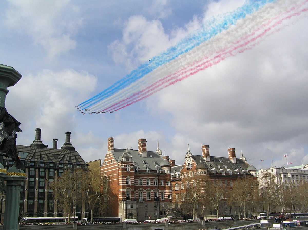 The Red Arrows fly over The Ministry of Defence in London during the RAF 90th anniversary flypast on 1 April 2008. The building on the left is Portcullis House, where most MPs have their offices. The Red Arrows were joined by four Typhoon jets. - Hilary Hoad (photographer)