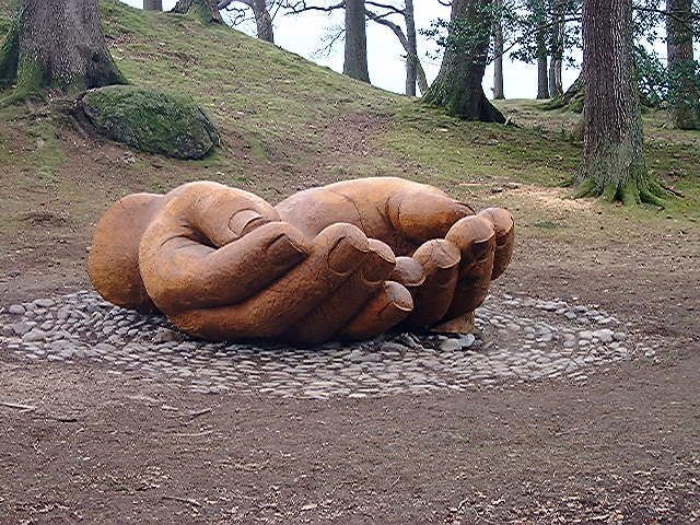 Hands carved out of tree near Brandelhow, on shore of Derwentwater, Lake District