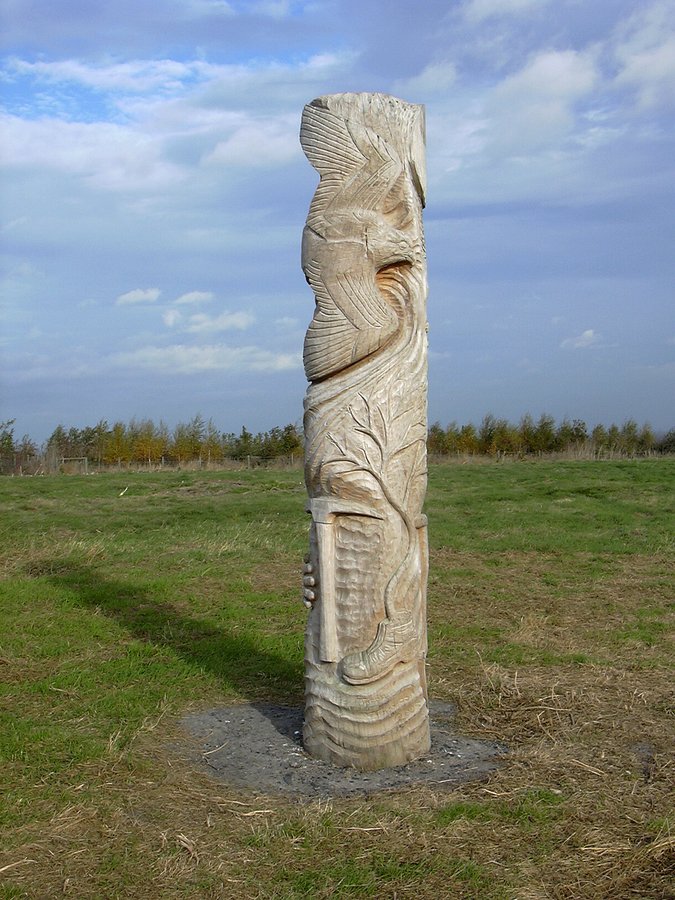 Formerly a colliery site, the community woodland contains tracks, nature trails and sculptures. The totem pole has mining related carvings at the base rising to natural subjects to represent the regeneration of the site.