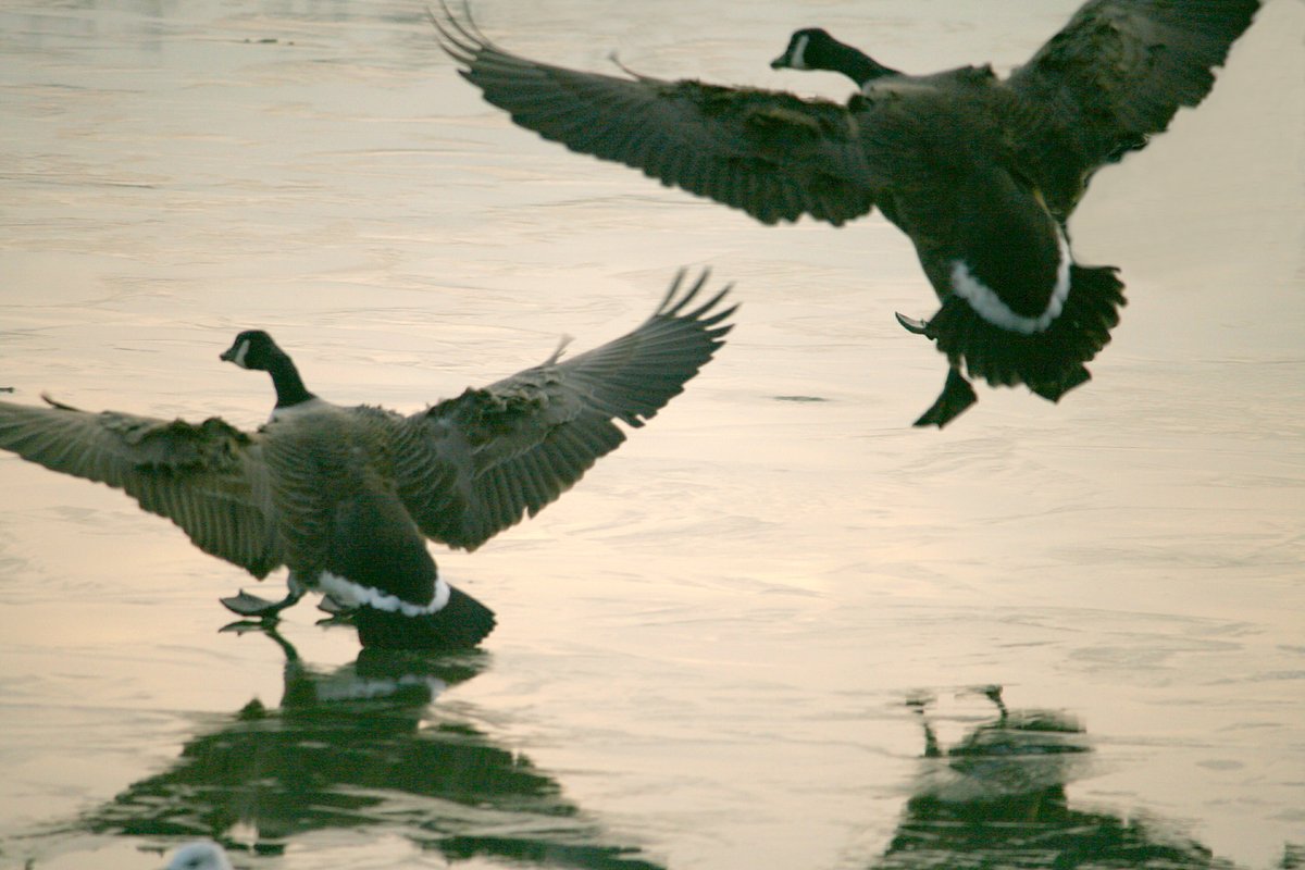 Canada Goose. Icy landing for these two geese.