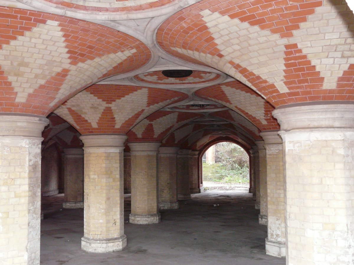 This was the way under the road into the Crystal Palace from the upper station. The station has been closed for years and years. The brickwork is very impressive. The dark circle was an outlet for gas lighting. - Stephen (photographer)