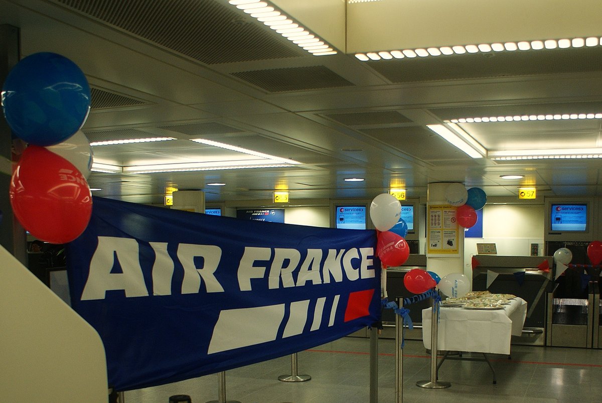 Air France desk with it's farewell to Terminal 2, they were the last to land a plane - The Paris flight (AF2080) at 21.15 that arrived at 21.26 but also the last to leave - The Paris (AF1881) that was to leave at 20.15 but also left late at 21.09 - Sean Grogan (photographer)