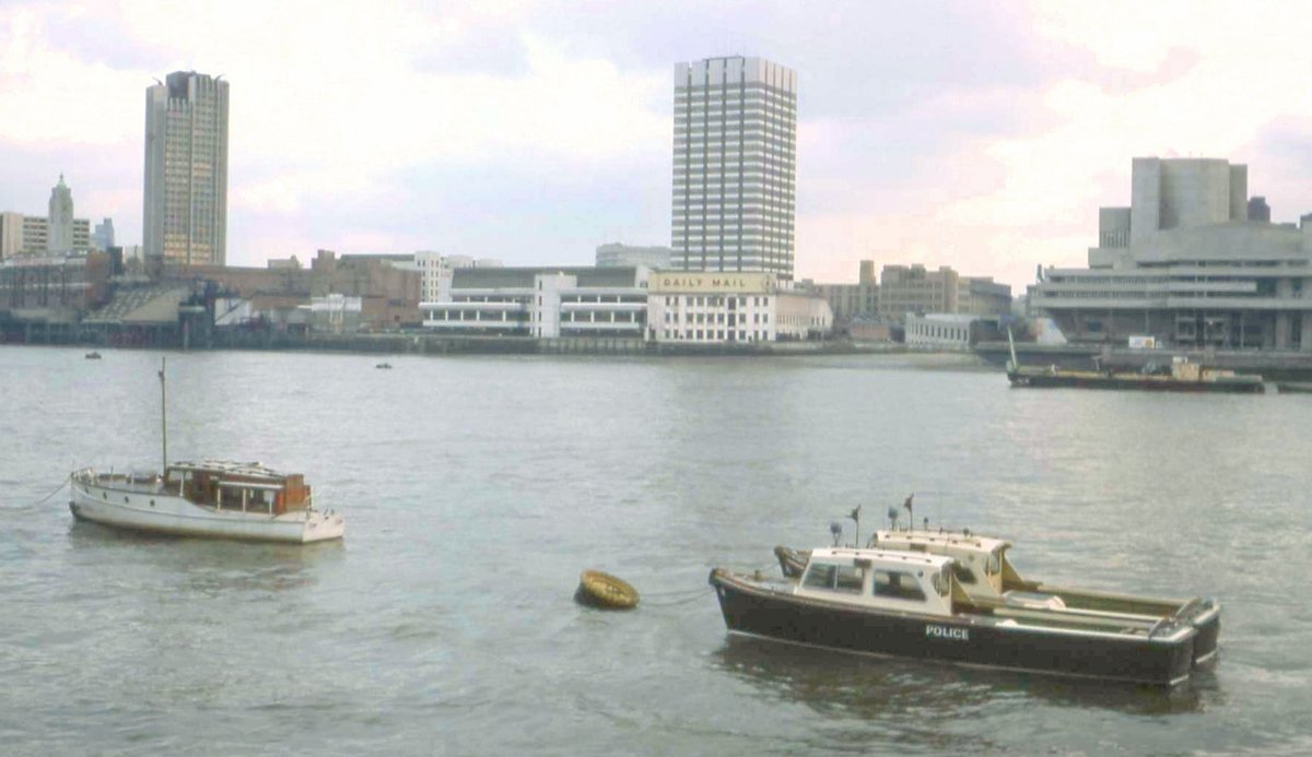 Police boats moored at Waterloo Police Pier on the River Thames - Victoria Embankment, February 1978. - Terry Gilley (photographer)