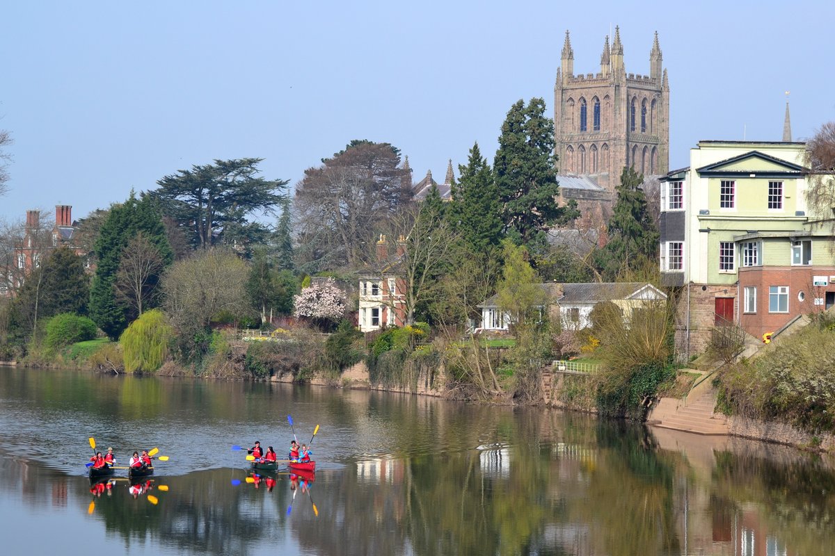 A gorgeous day in Hereford. Here you can see some people having fun on the river Wye with the very impressive cathedral in the background.