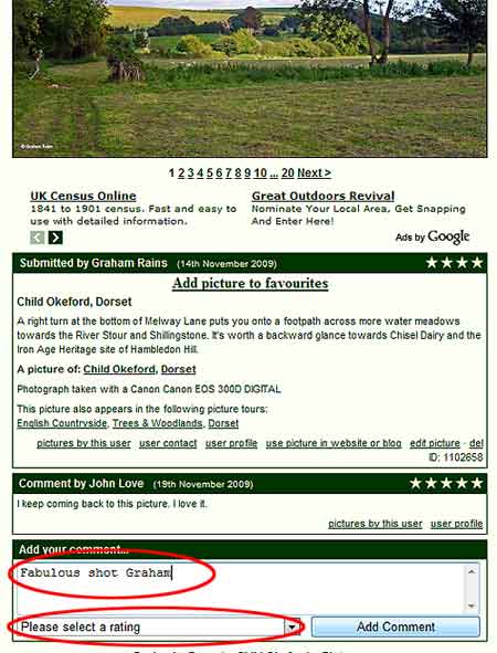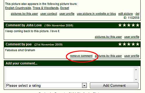 To comment on a picture, simply use the form below the image. Type in your comment, then give the picture a rating (1 to 5 stars), then click the 'Add Comment' button. Your comment will then instantly appear.