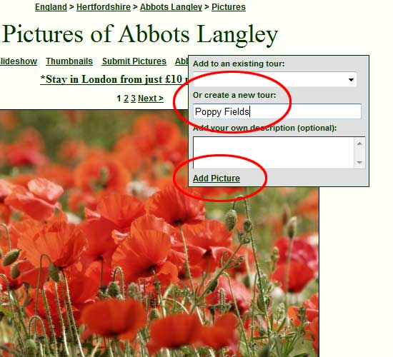 The next time you add a picture to your tour, because the tour has already been created, simply use the drop-down box at the top of the grey box, labelled 'Add to an existing tour' to select the name of the tour, and then click 'Add Picture'.